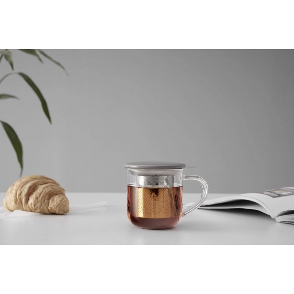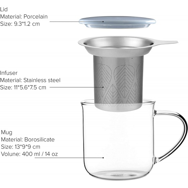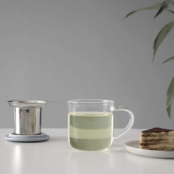 Cana ideala de ceai, din sticla borosilicata, are un infuzor din otel inoxidabil, foarte fin, care asigura o filtrare optima a bauturii si o textura pura indiferent de marimea frunzelor de ceai: de la marunte, cum e cazul ceaiului Rooibos, pana la frunze mai mari din ceaiul alb. Iar capacul canii poate fi folosit convenabil si ca suport pentru infuzor.