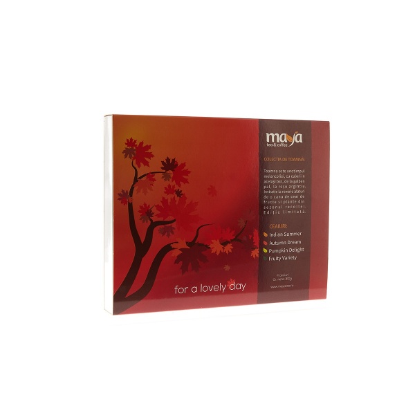 Toamna este anotimpul melancoliei, cu culori in acelas ton, de la galben pal, la rosu argintiu. Invitatie la reverie alaturi de o cana de ceai de fructe si plante din sezonul recoltei. Editie limitata.